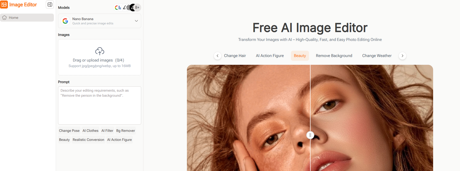 在视觉为王的时代,您是否曾因复杂的专业软件而放弃修改一张图片?是否渴望只需动动手指输入想法,就能获得令人惊艳的视觉效果?现在,Image Editor 应运而生,它将强大的人工智能技术融入在线图像编辑,让“语言”成为您最直接的创作工具。